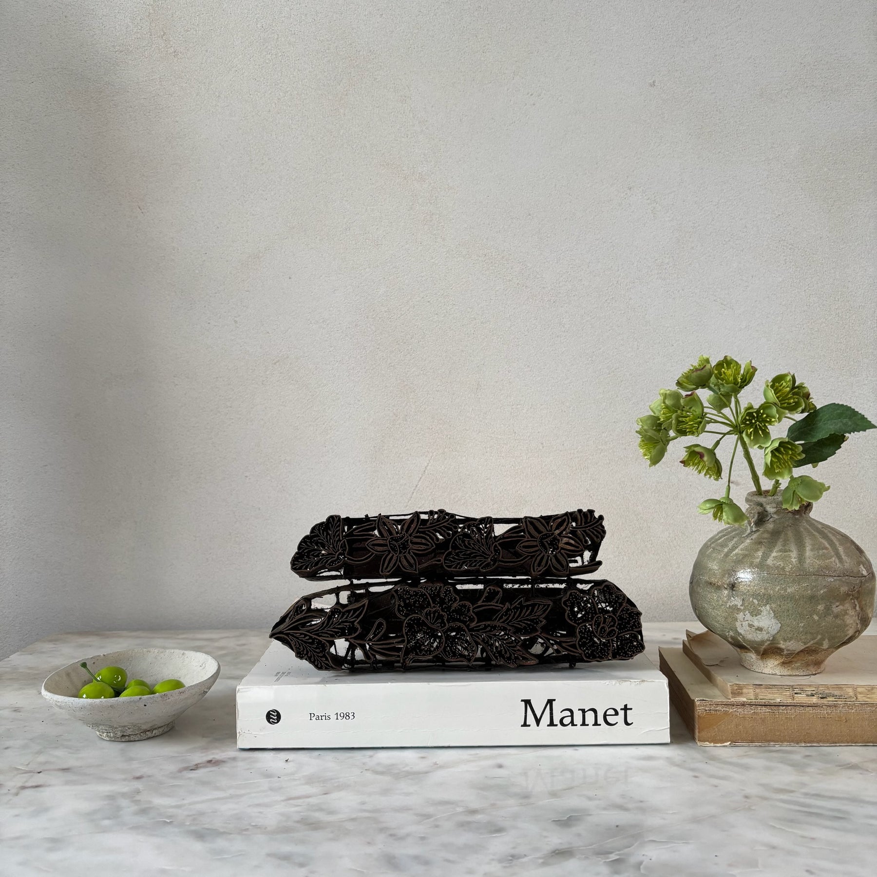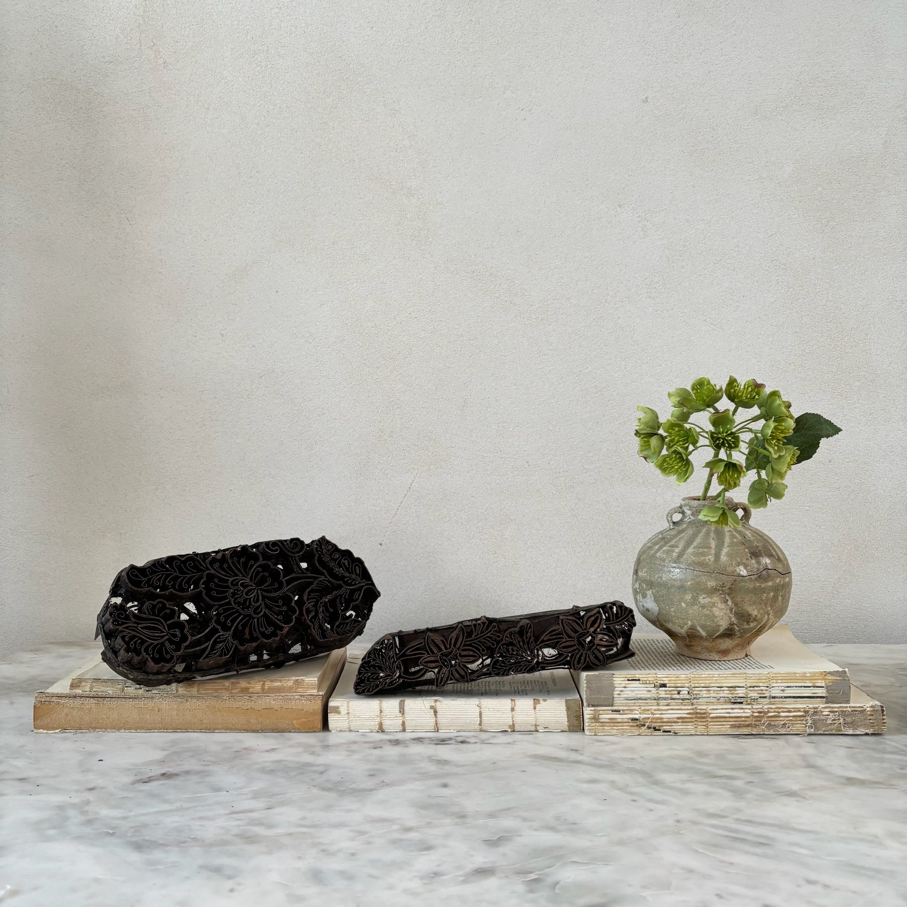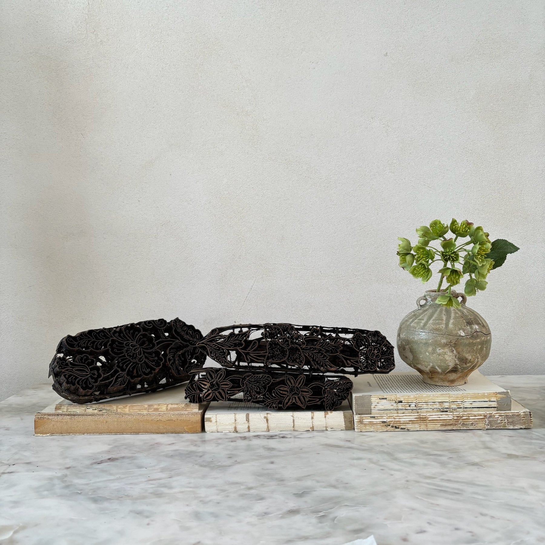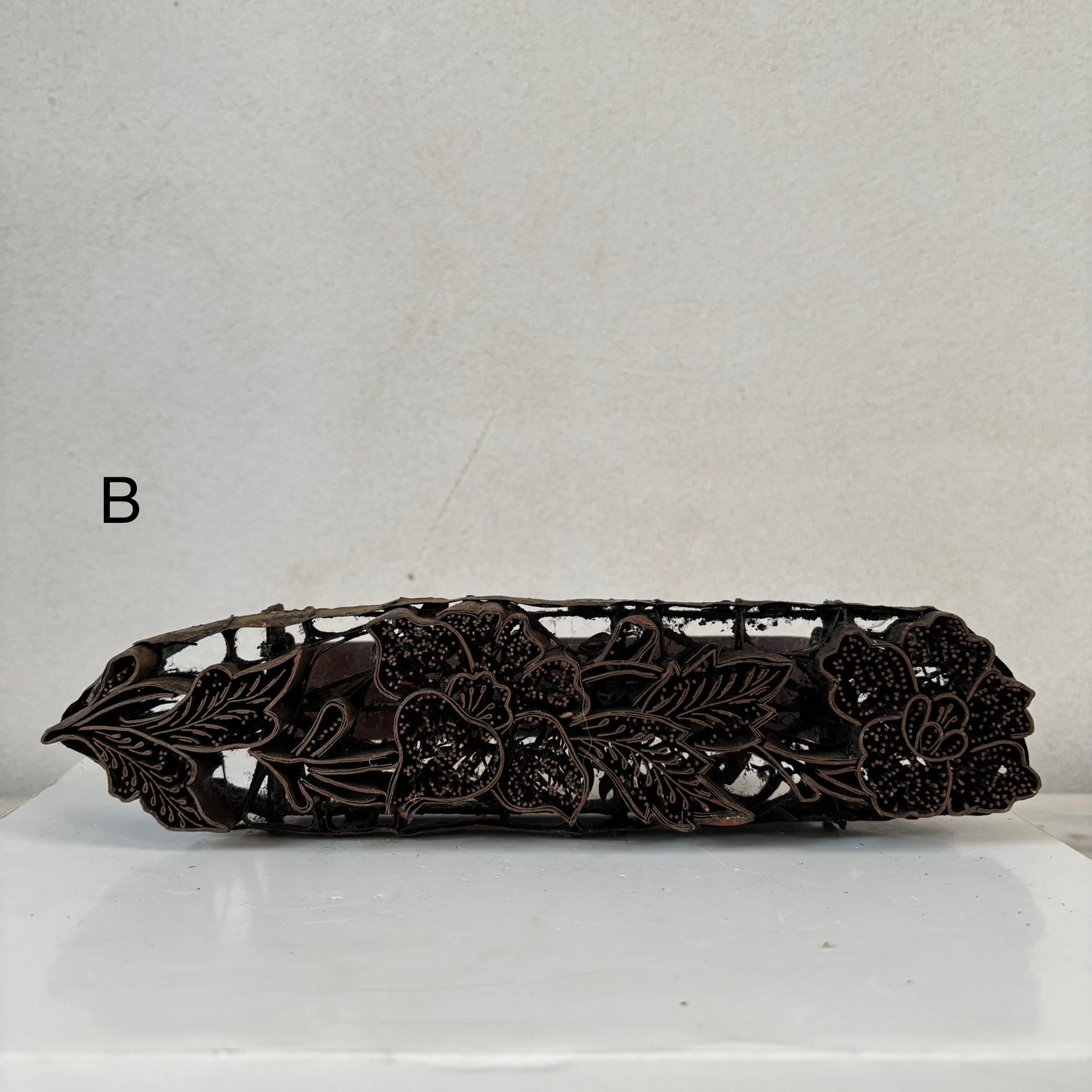 Originally used to press wax into fabric to make batik textiles. The art of batik is a speciality of the Indonesian Islands with each village having their own unique designs which are used in family and village prints for sarongs and other garments worn of festival days.
