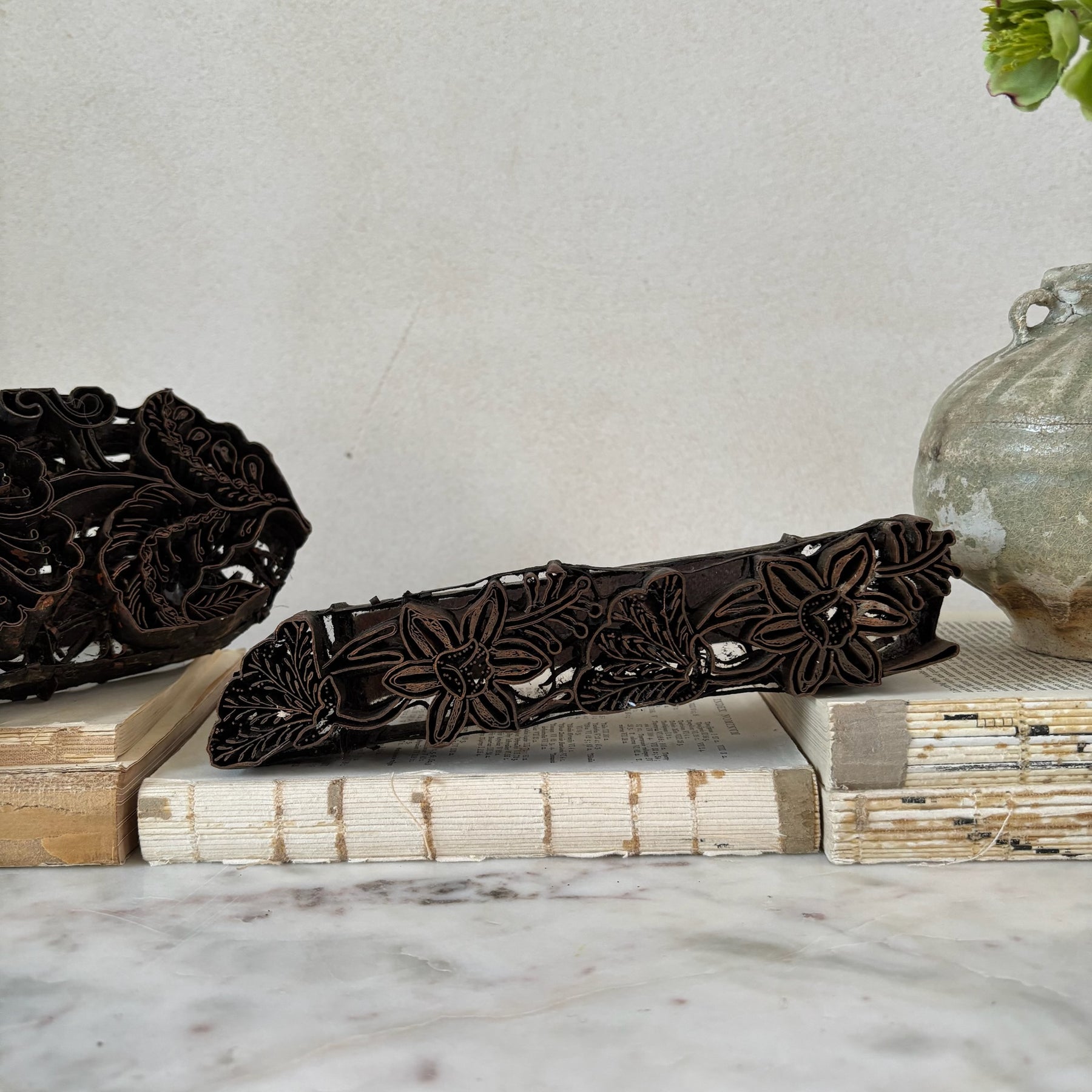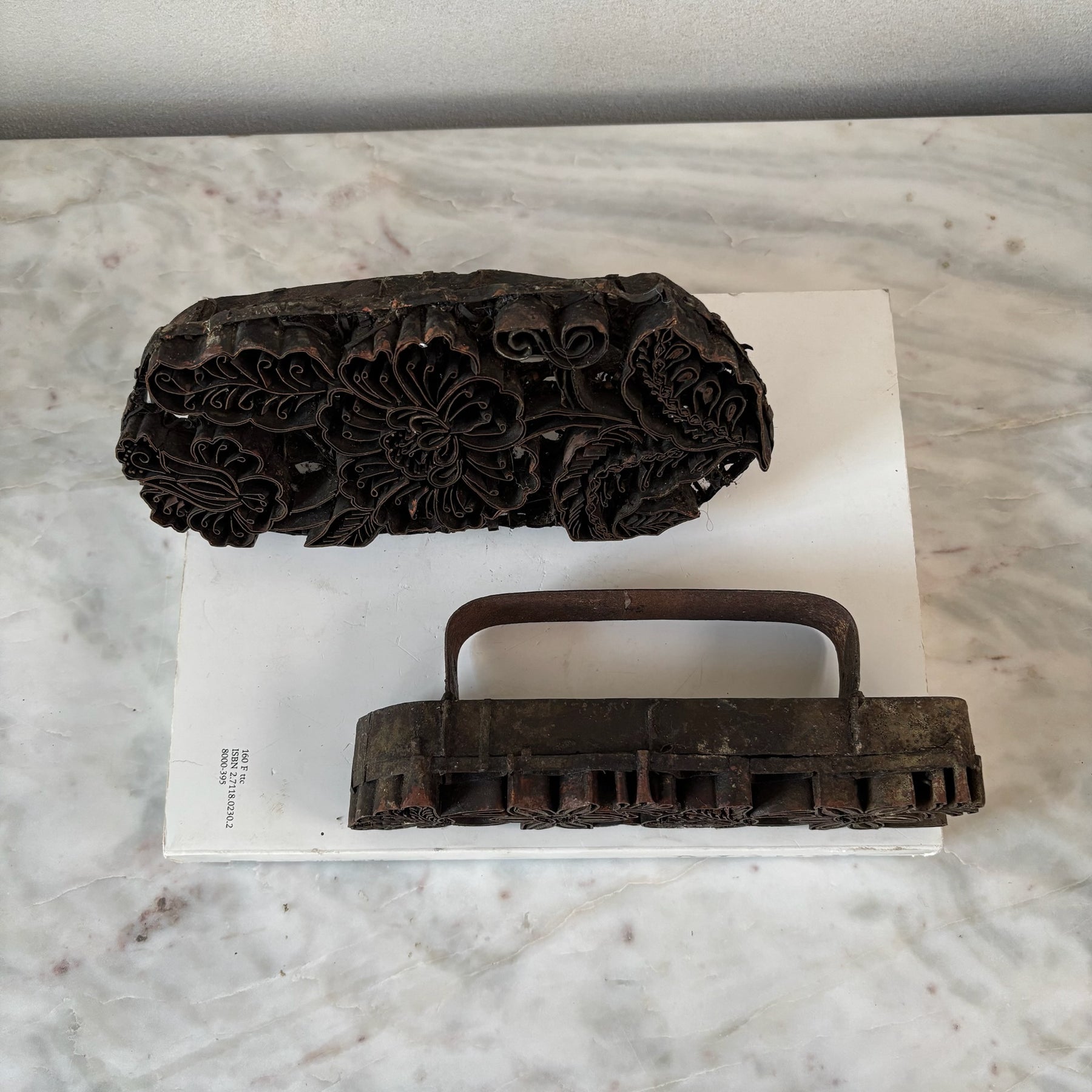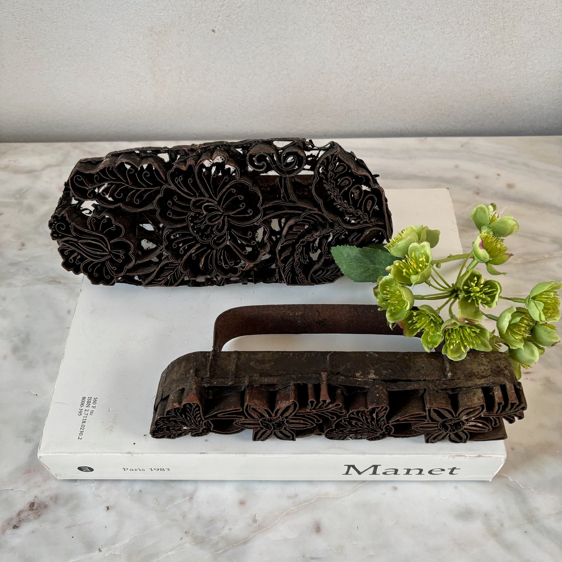 Each our vintage mid century copper batik stamps bears a floral motif.
