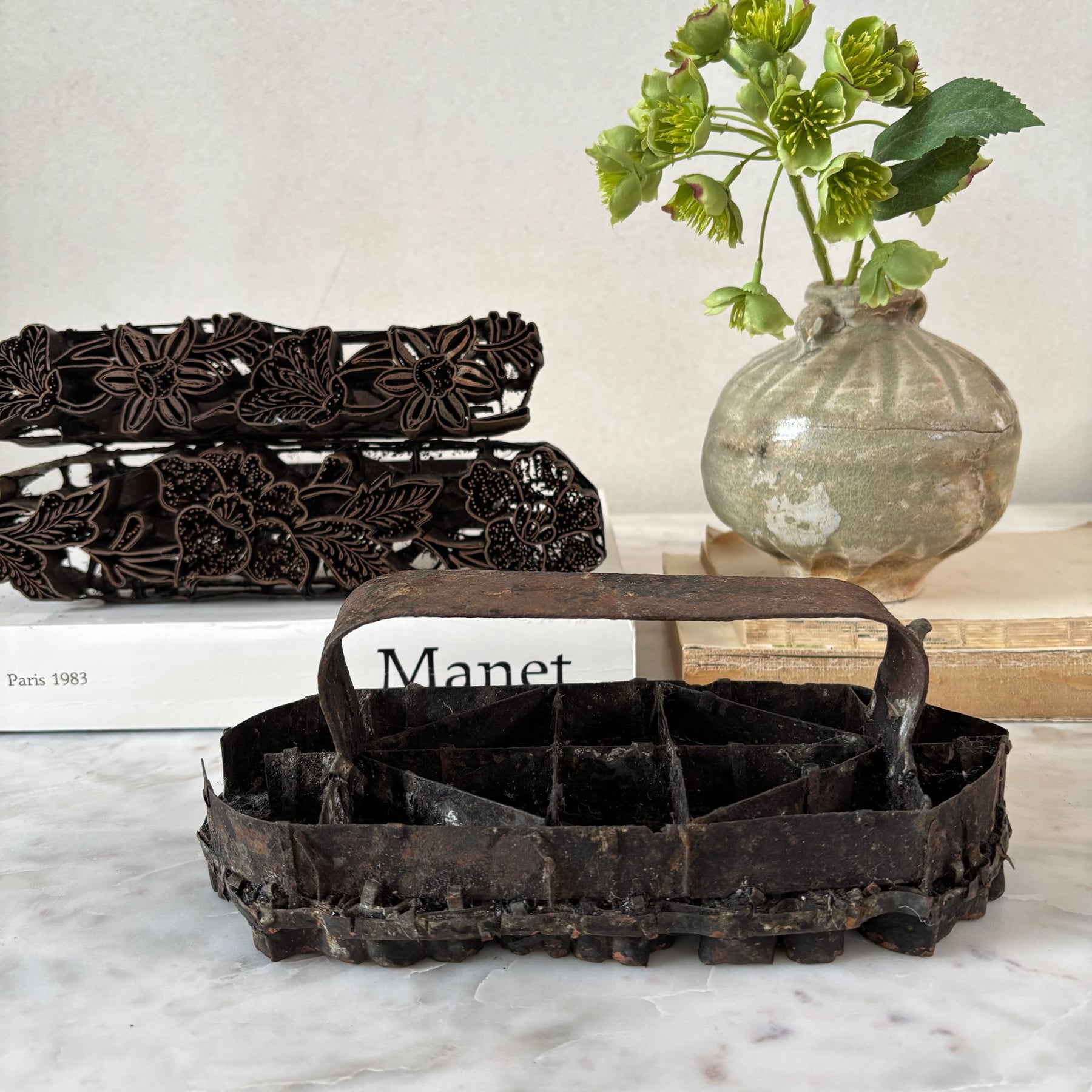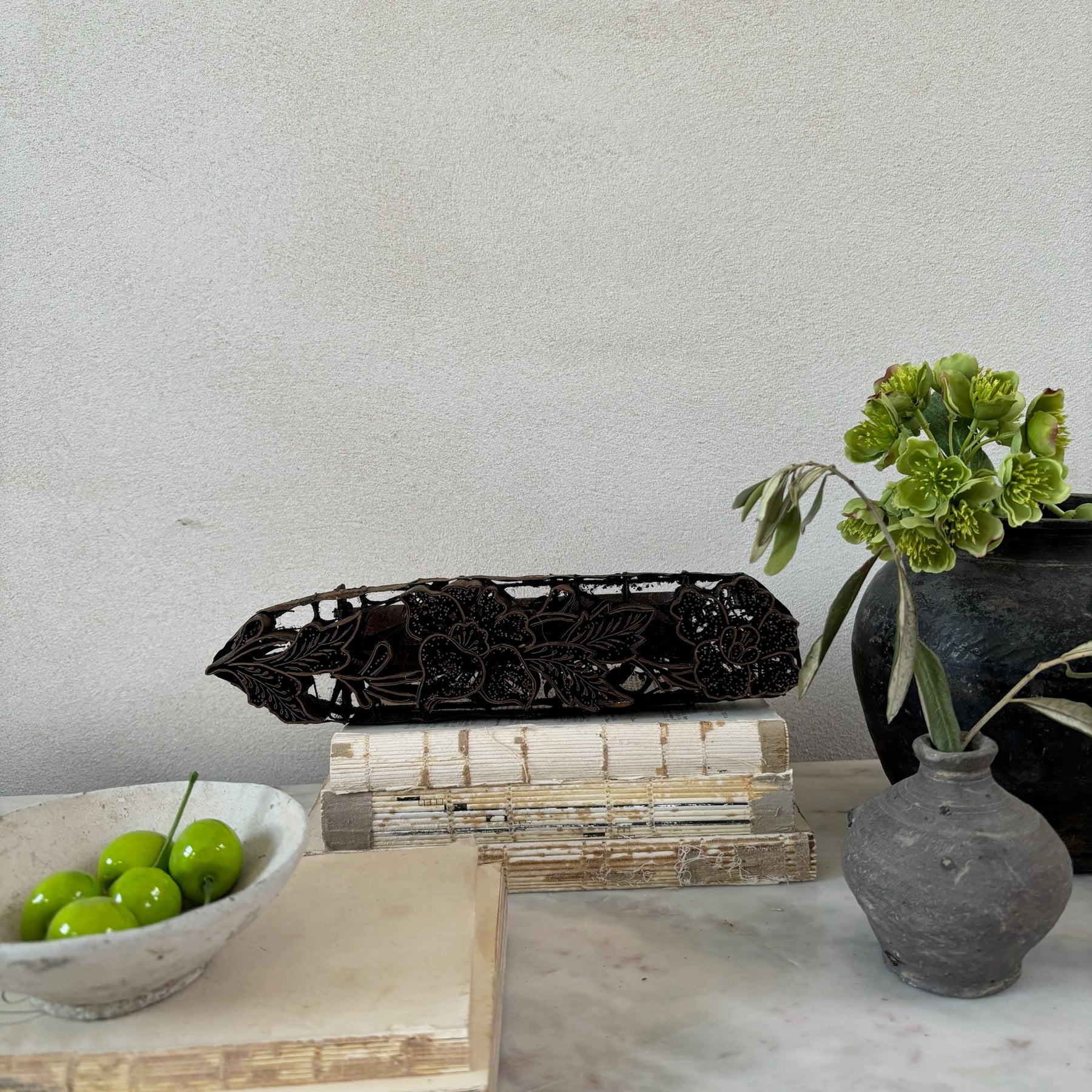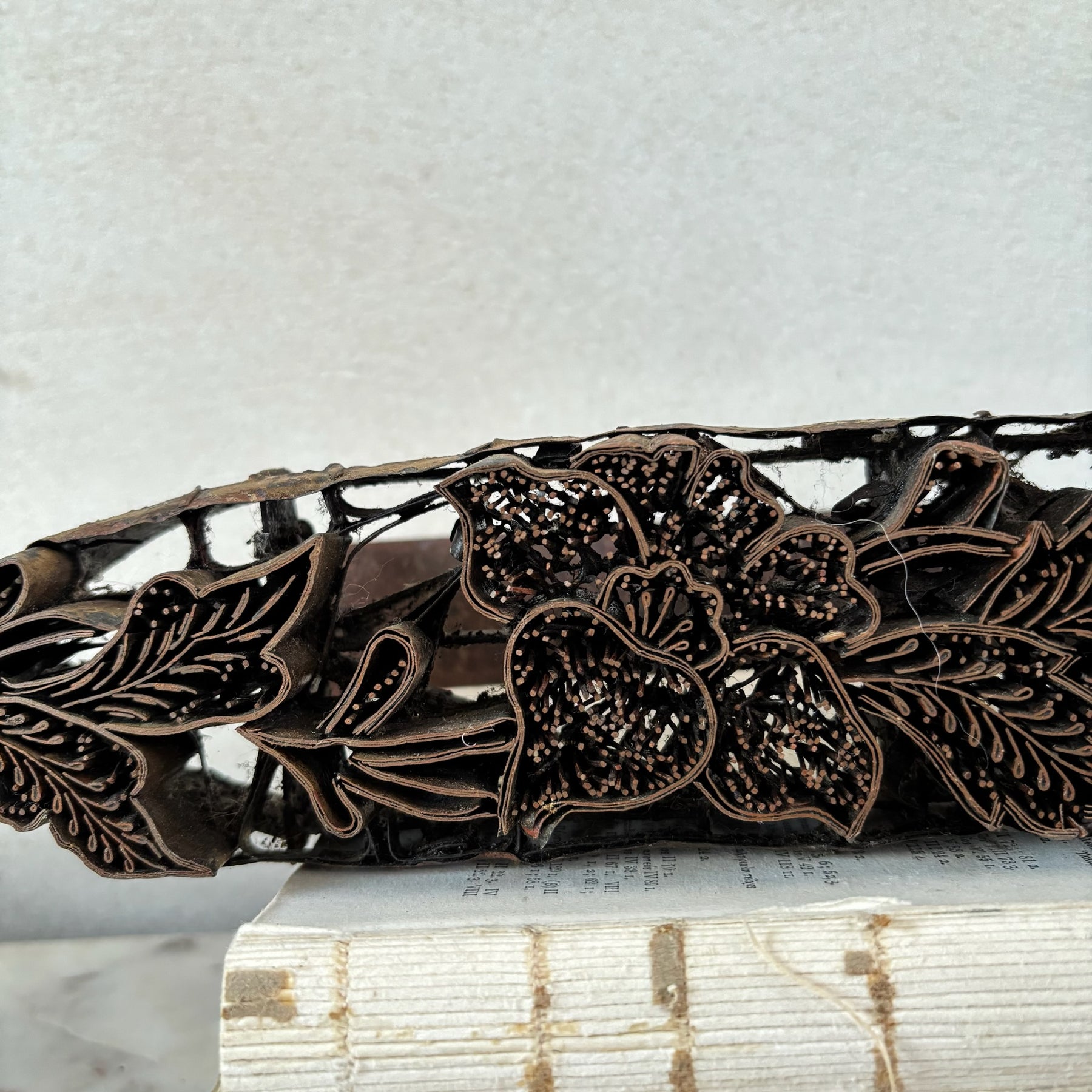 Each our vintage mid century copper batik stamps bears a floral motif.