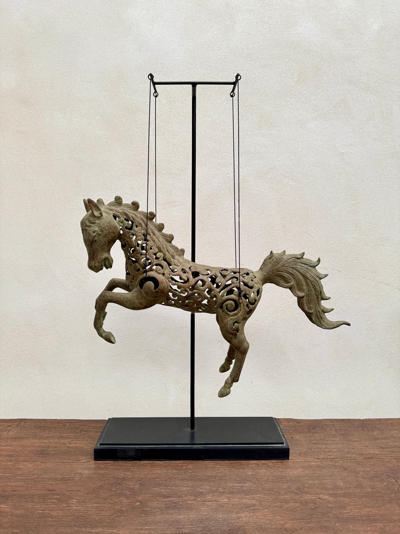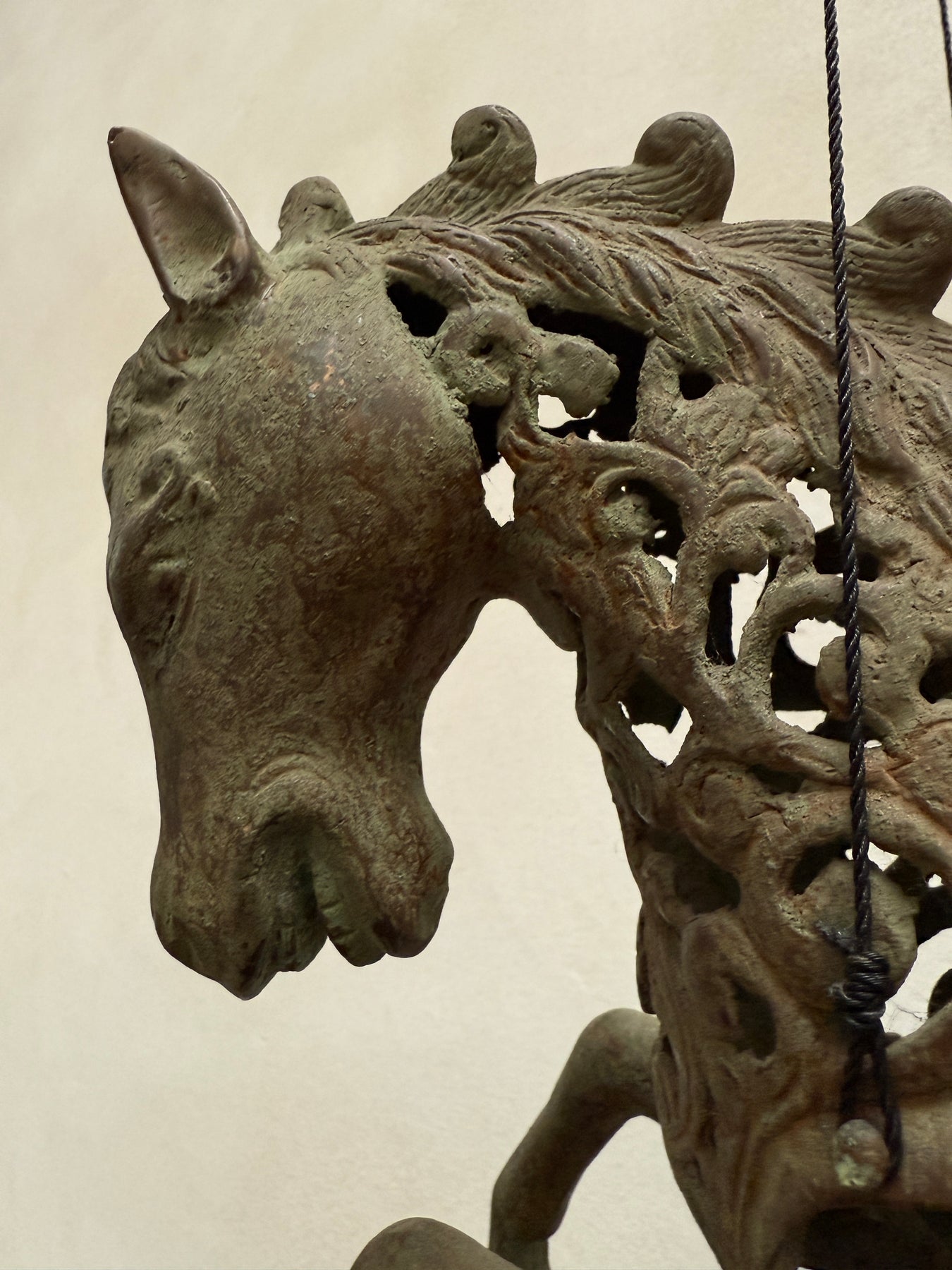 Made from cast bronze this ornate prancing horse is made from bronze and is suspened and hung on a black wooden stand.