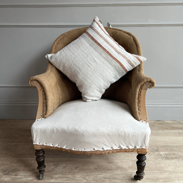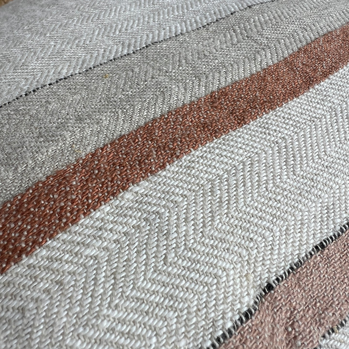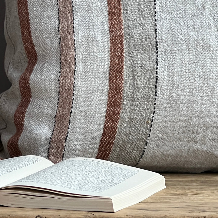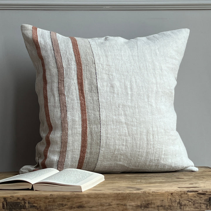 A fabulous linen cushion in wonderful neutral hues of stone & brown. Featuring a complimenting striped pattern, it is crafted from 100% heavyweight pure linen, and the weave of this hand-dyed fabric features organic and beautiful variations. Super soft to the touch this is the ideal seasonal, transitional cushion. Ideal for popping onto a sofa or guest bed.