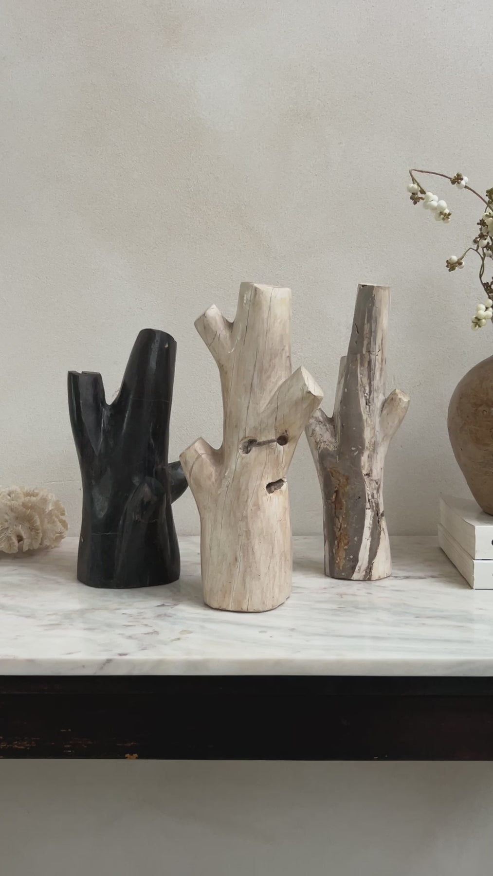 These striking sculptures are formed from ancient tree branches that have undergone the natural process of petrification over millions of years, where organic material is slowly replaced by minerals, transforming wood into stone. The result is a remarkable preservation of the original grain, knots, and branching forms, captured forever in solid form.