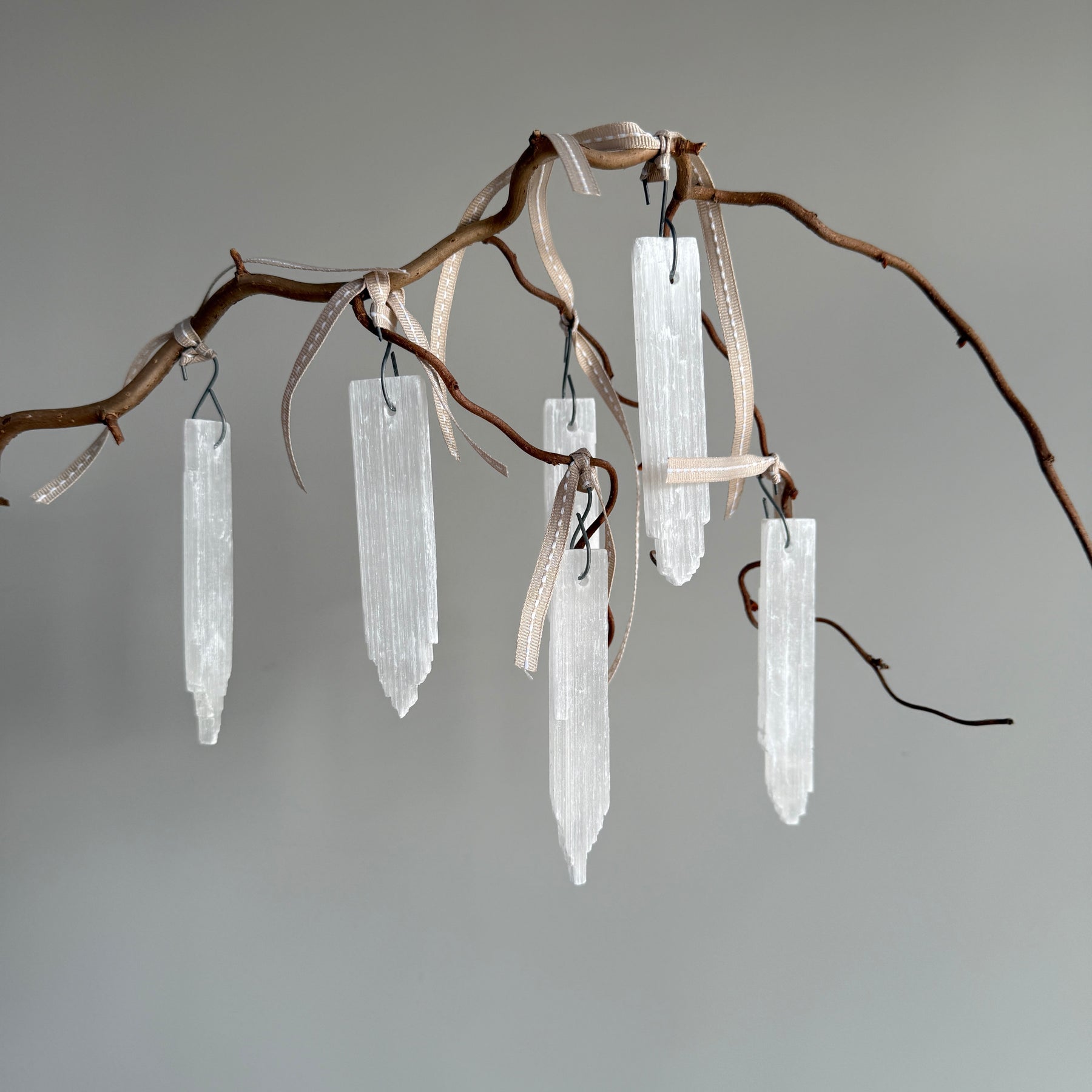 Set of six natural selenite stick drops which look like icicles. Selenite is a natural crystal with a semi translucent appearance. Perfect for a window or branch year round and of course on your tree in December.