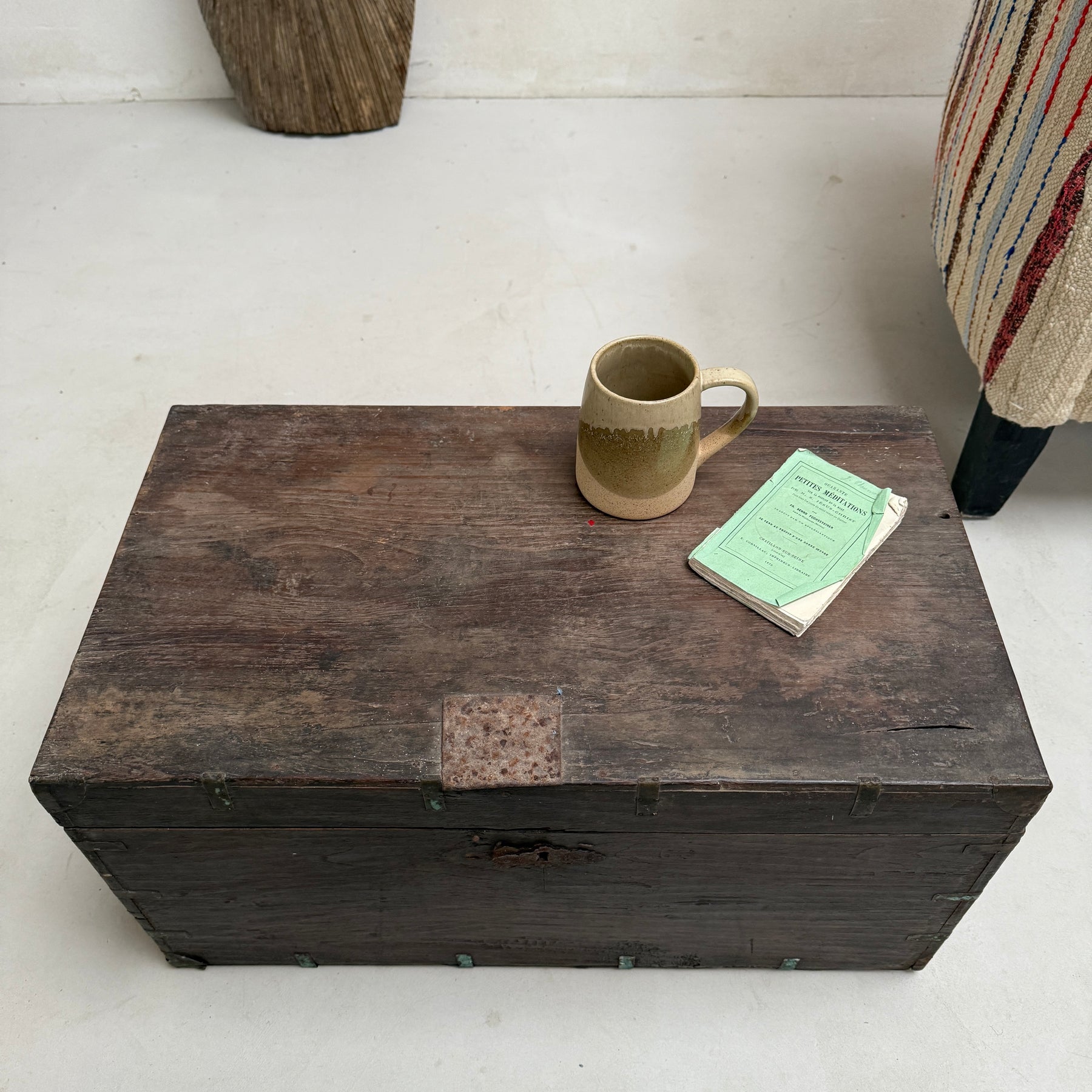 Crafted from solid timber and featuring the original hardware and ironmongery, this characterful rustic antique trunk is one-of-a-kind.