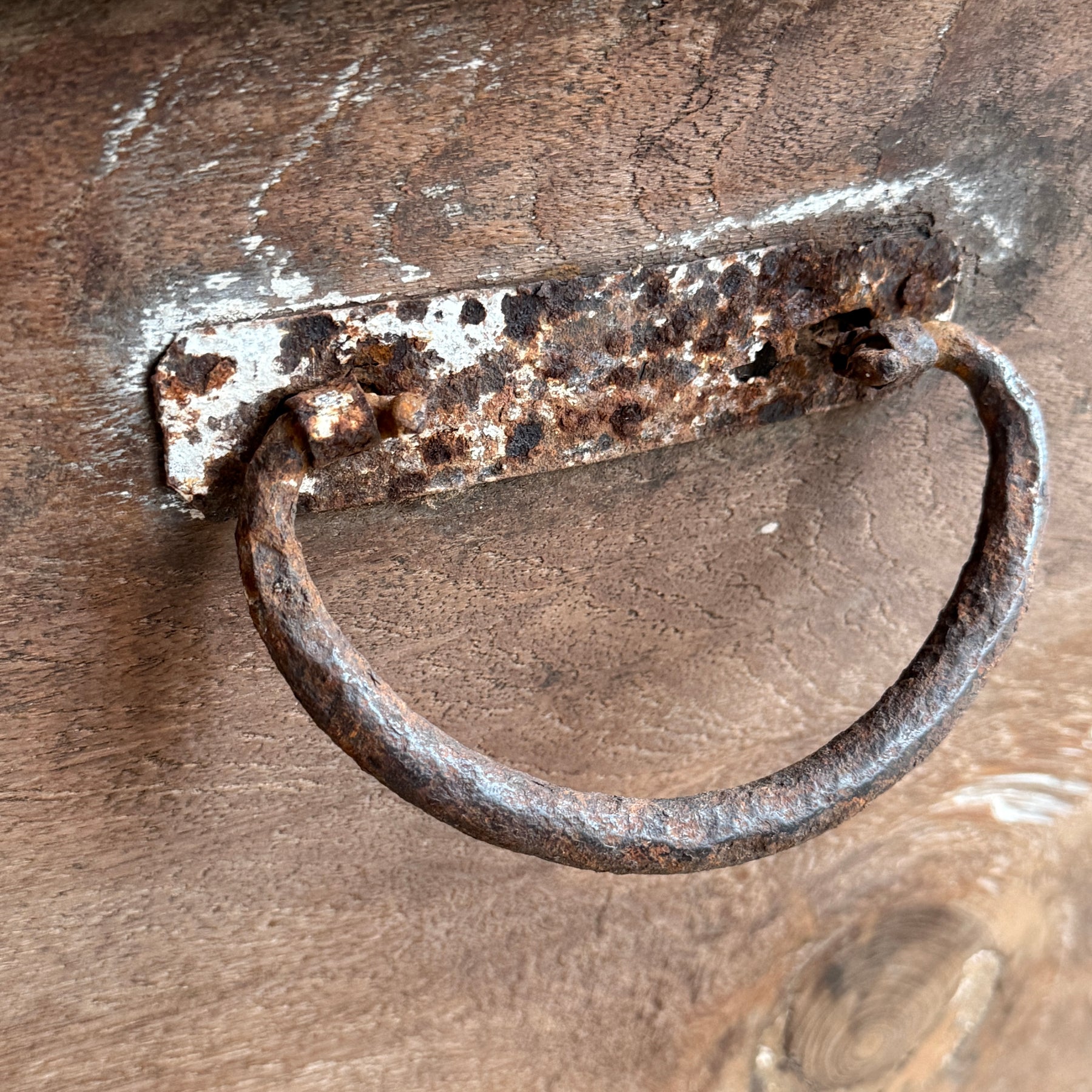 Crafted from solid timber and featuring the original hardware and ironmongery, this characterful rustic antique trunk is one-of-a-kind and is large enough to be used as a side table or seat in an entrance hall.