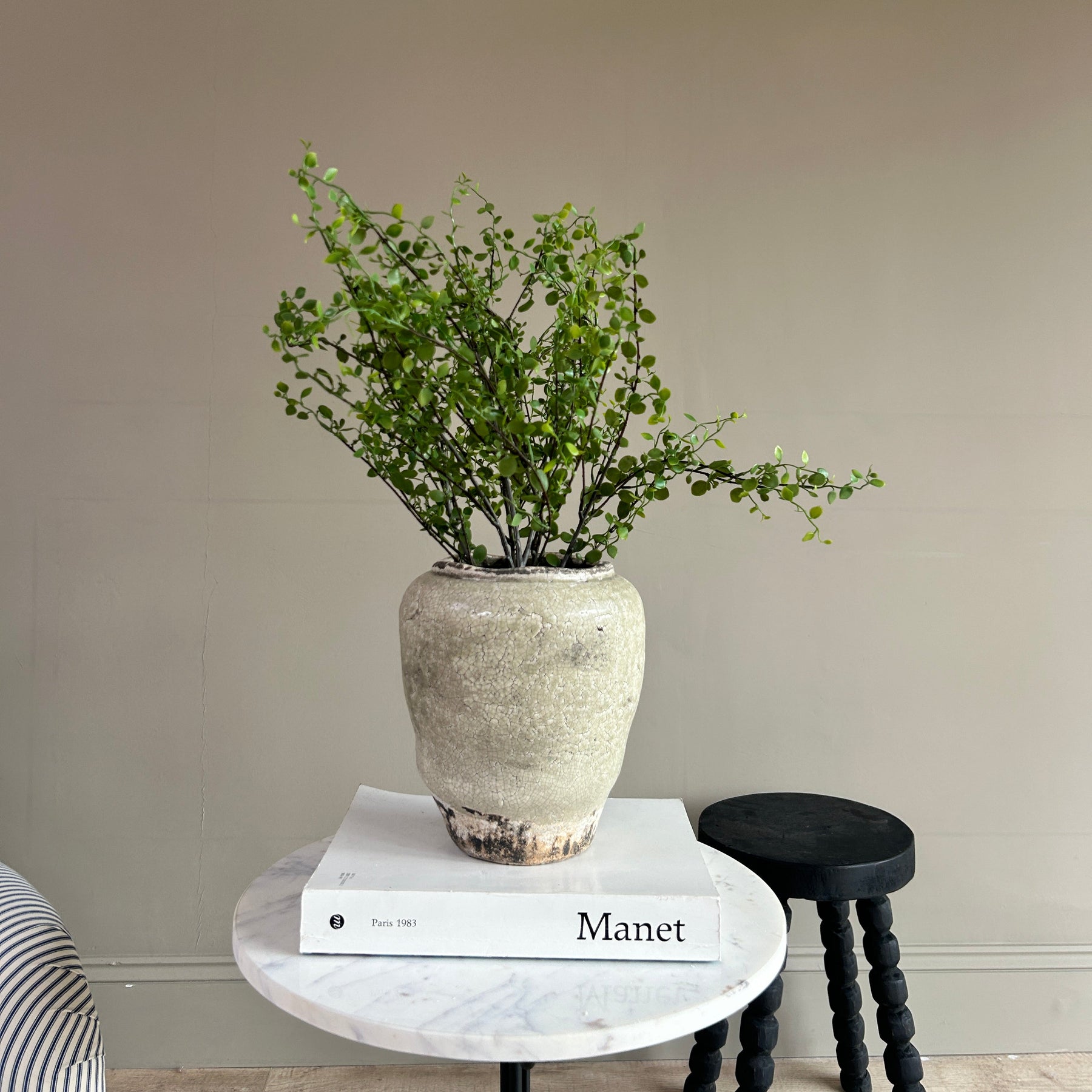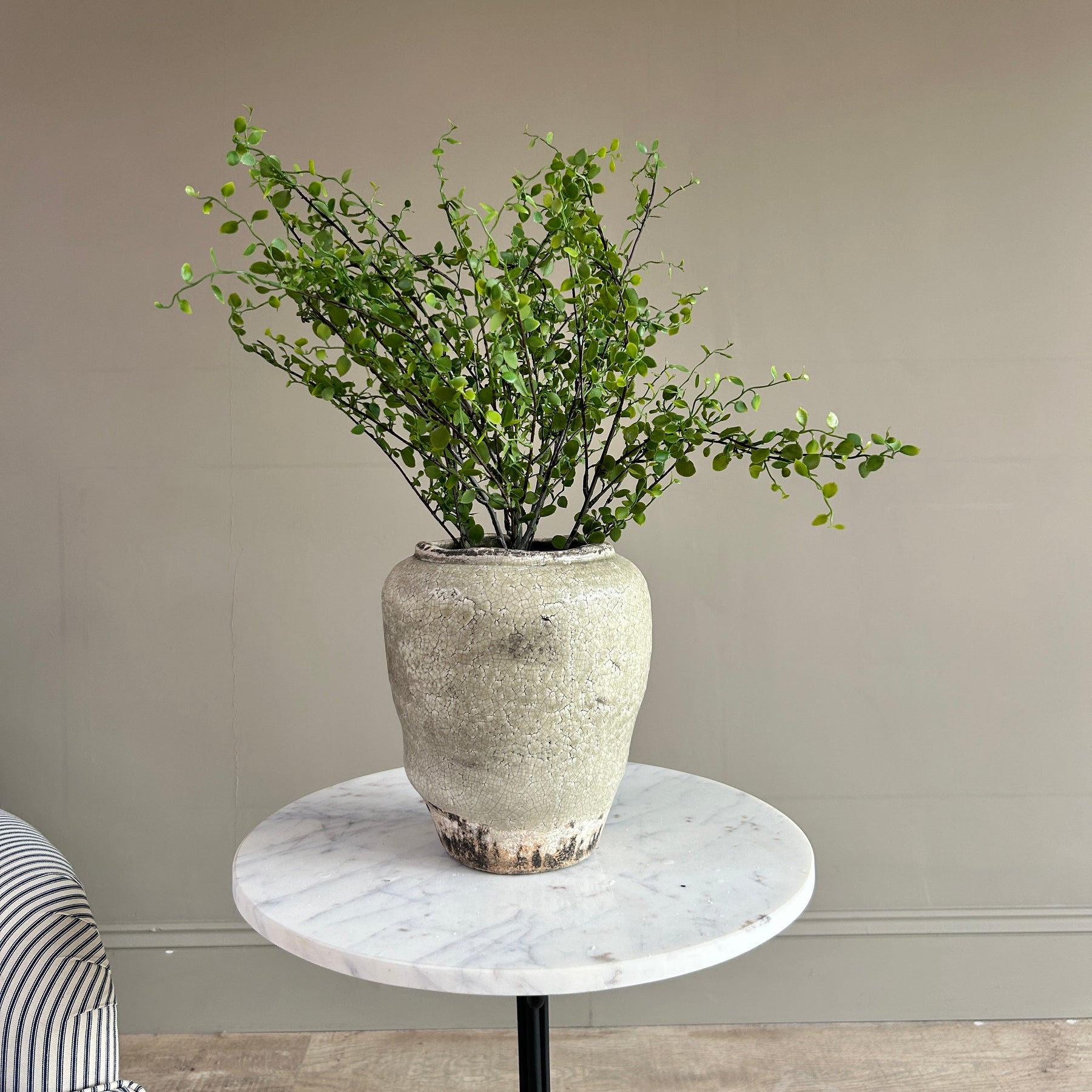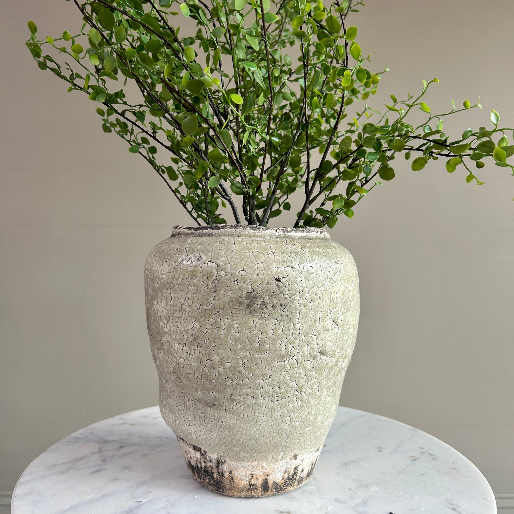The muted, chalky glaze is contrasted by a slightly darker, naturally weathered base, grounding the piece and enhancing its antique look. Each pot has its own variation in tone and crackle, making it feel considered rather than uniform.