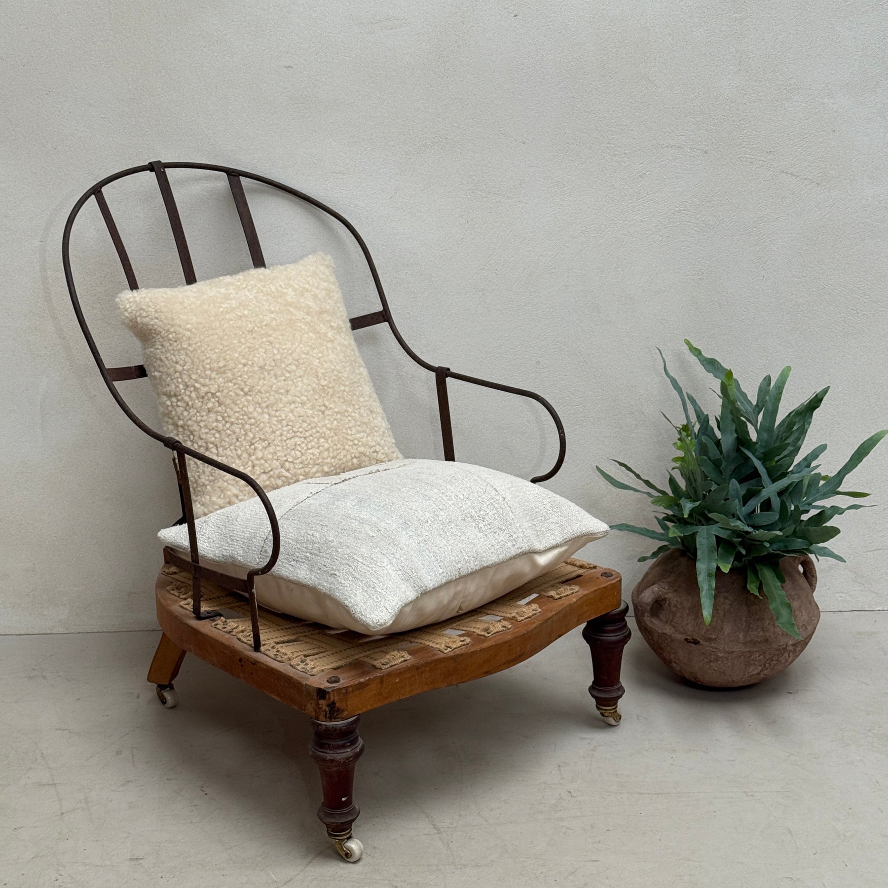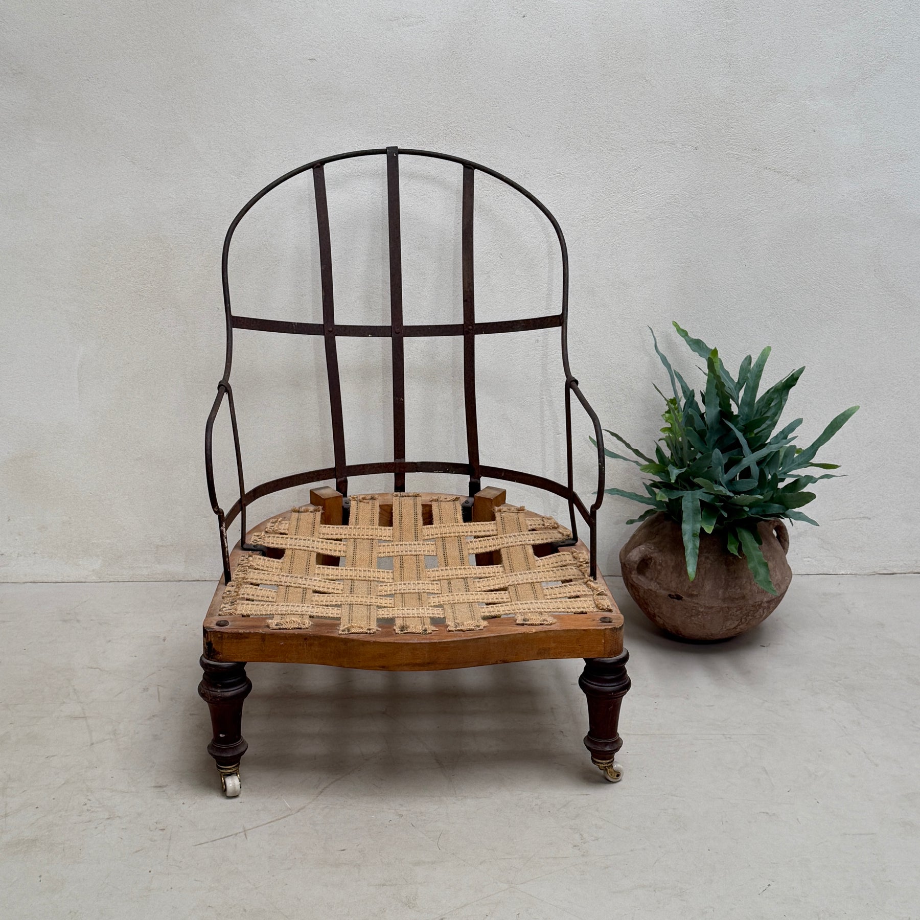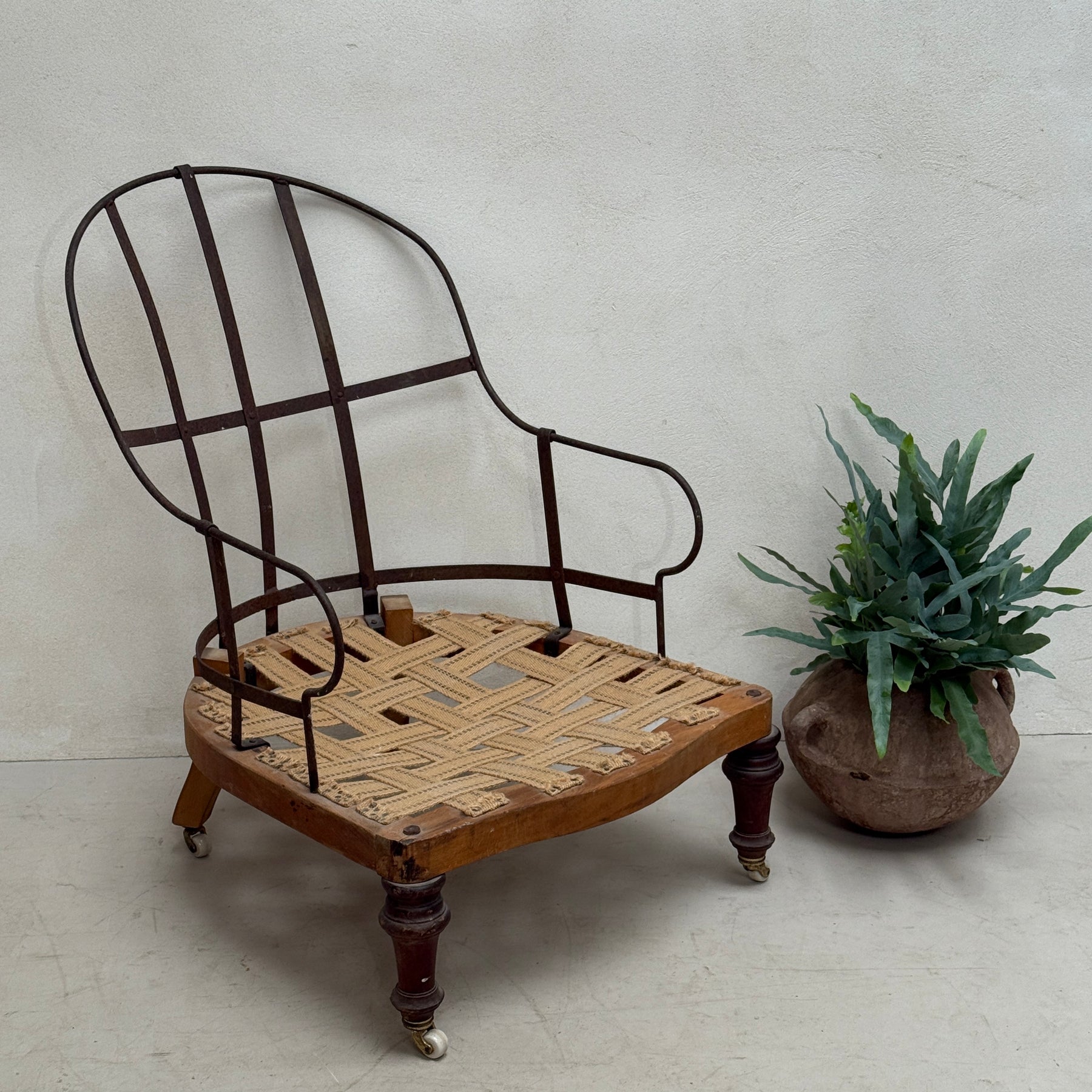 The Antique Iron frame Armchair is a genuine and original piece from the late 19th to early 20th century. Its deconstructed design highlights the beautiful timber construction and vintage stitching, while the exposed horsehair interior and stripped-back seat material give insight into its true character.