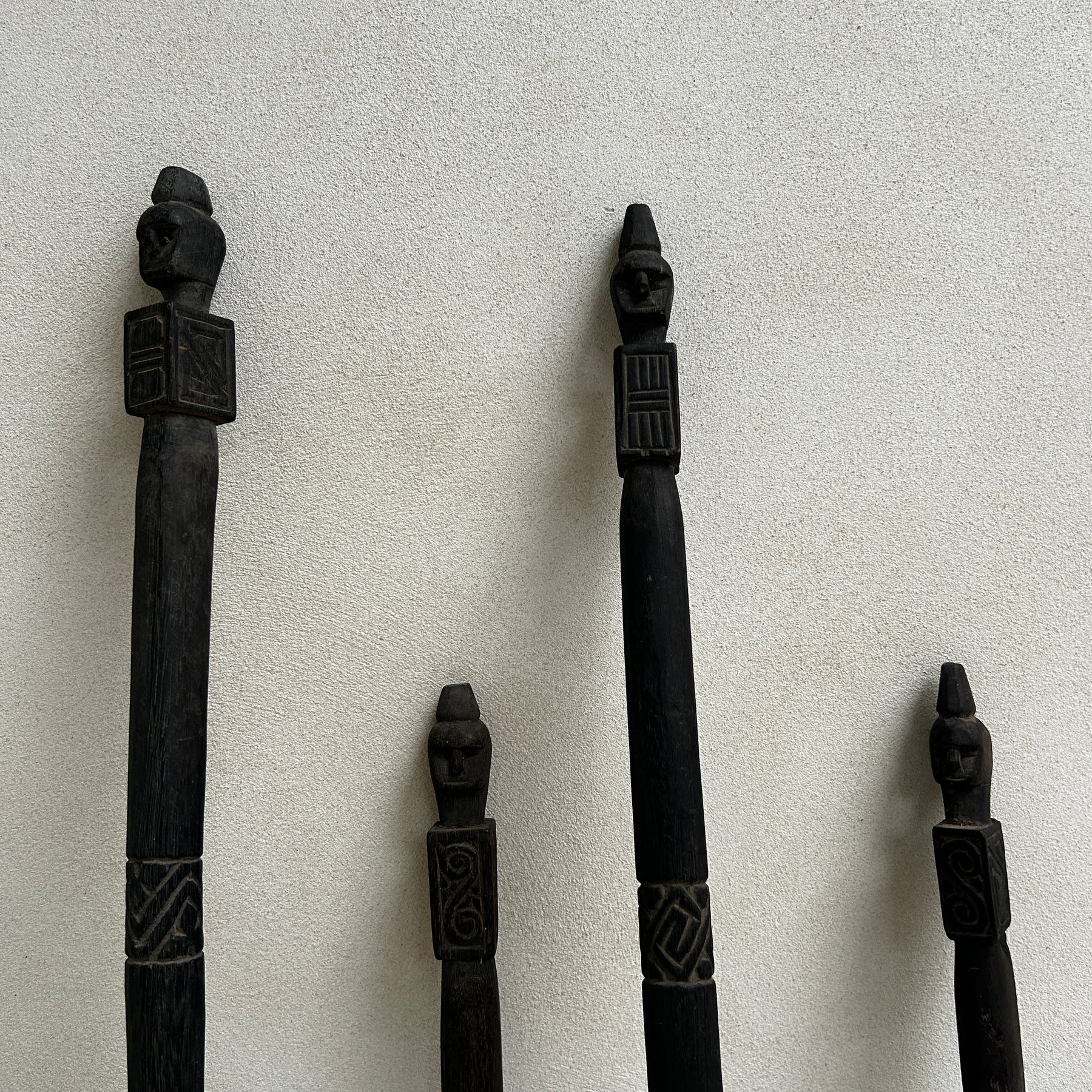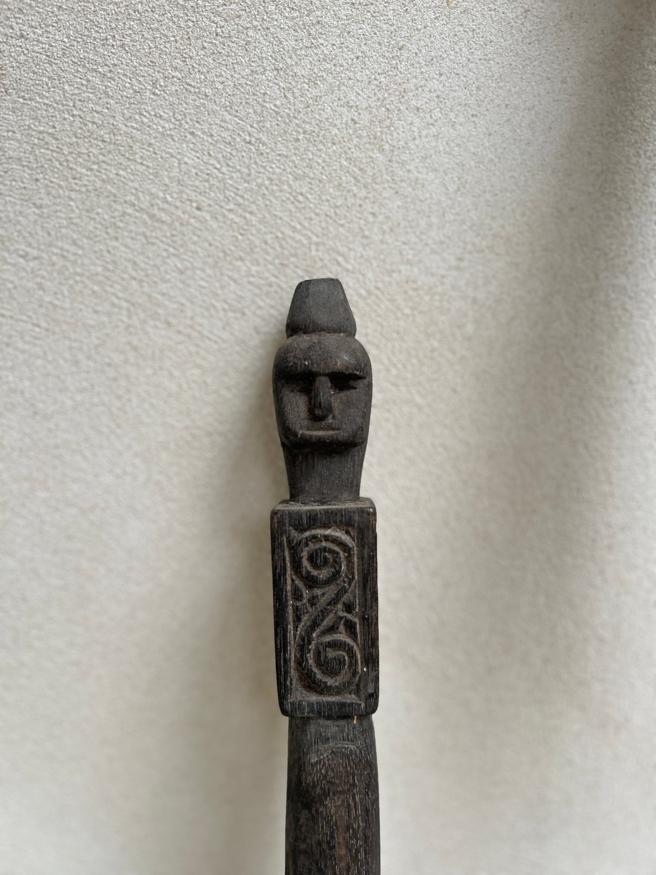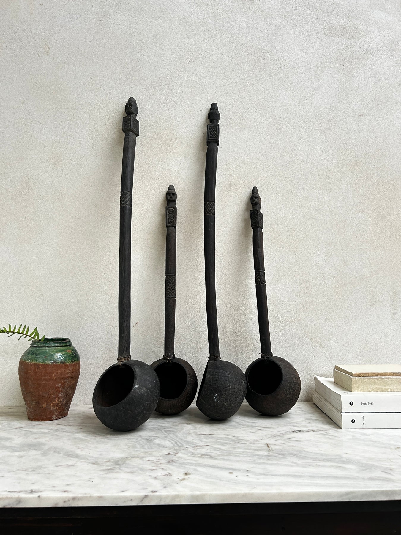 Originally functional household tools, these ladles now shine as sculptural decorative objects, perfect for adding depth and character to shelves, consoles or curated wall displays. Their tall, slender silhouettes introduce verticality and movement, while the carved faces infuse each piece with presence and personality.
