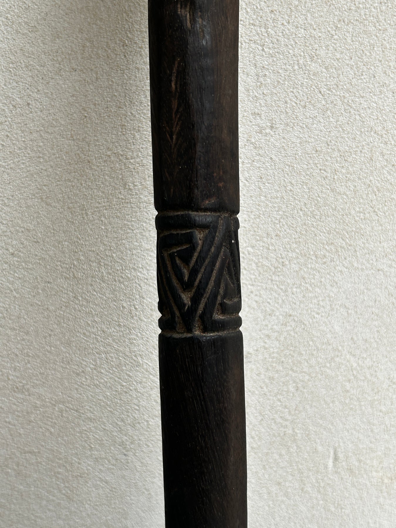 The bowls are carved from hollowed coconut shells, while the elongated wooden handles feature intricate incised patterns and stylised faces. Their deep, aged patina has developed over decades of use, giving the wood a beautifully darkened tone and tactile texture.