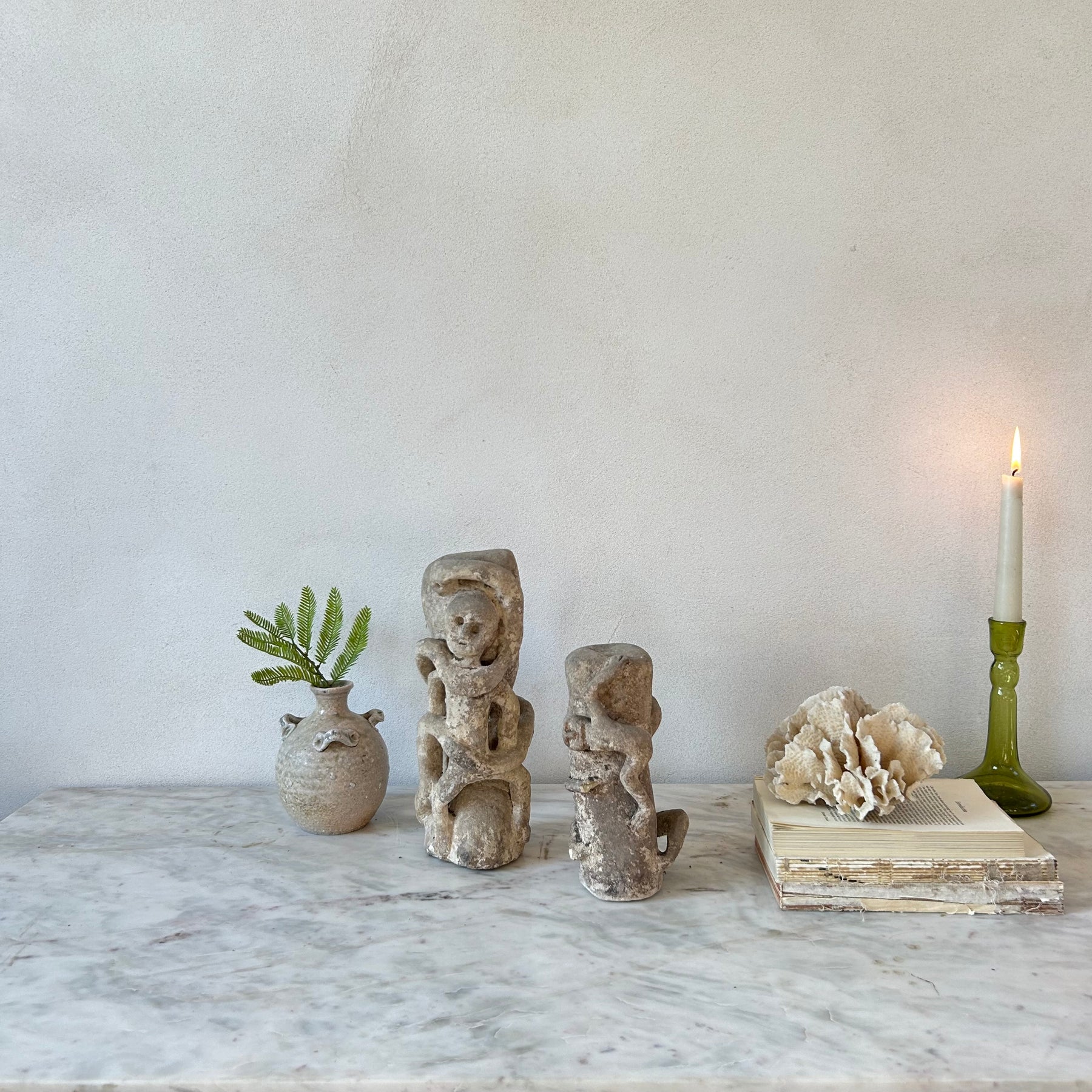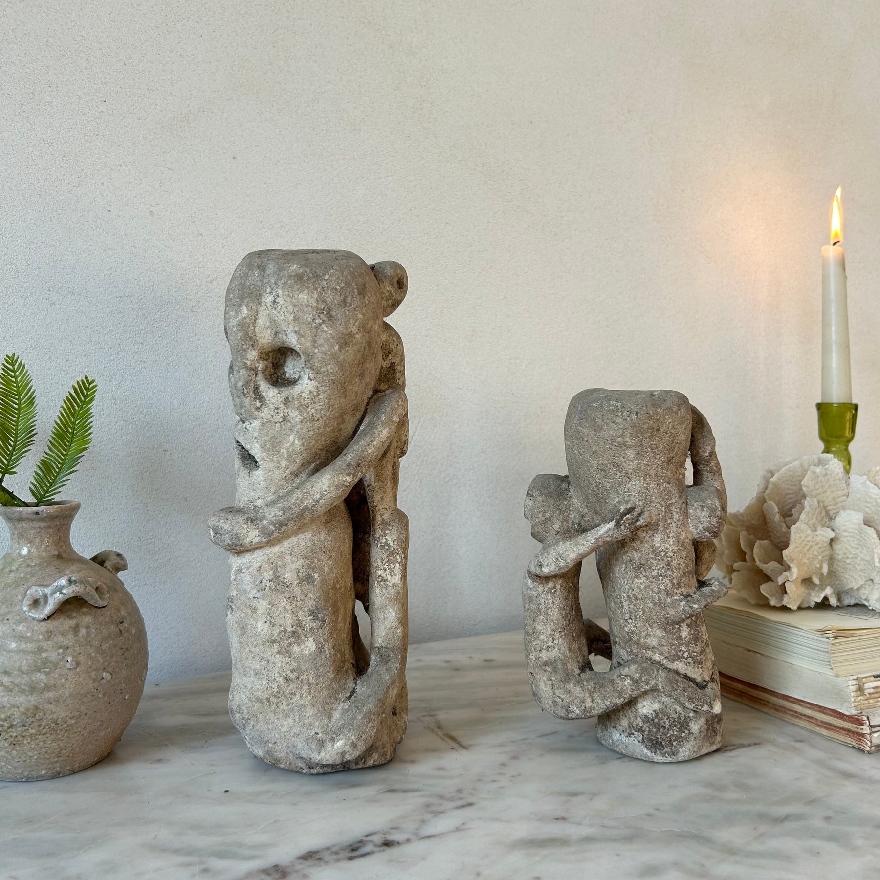 Each statue is carved by hand from solid stone, with subtle variations in features and proportion that highlight its artisanal origins. The surface shows a naturally weathered patina with soft edges, small pits and tonal variation in the stone, all of which speak to its age and character. These marks and imperfections are intentionally left visible and celebrated, reflecting the history and story of each piece.