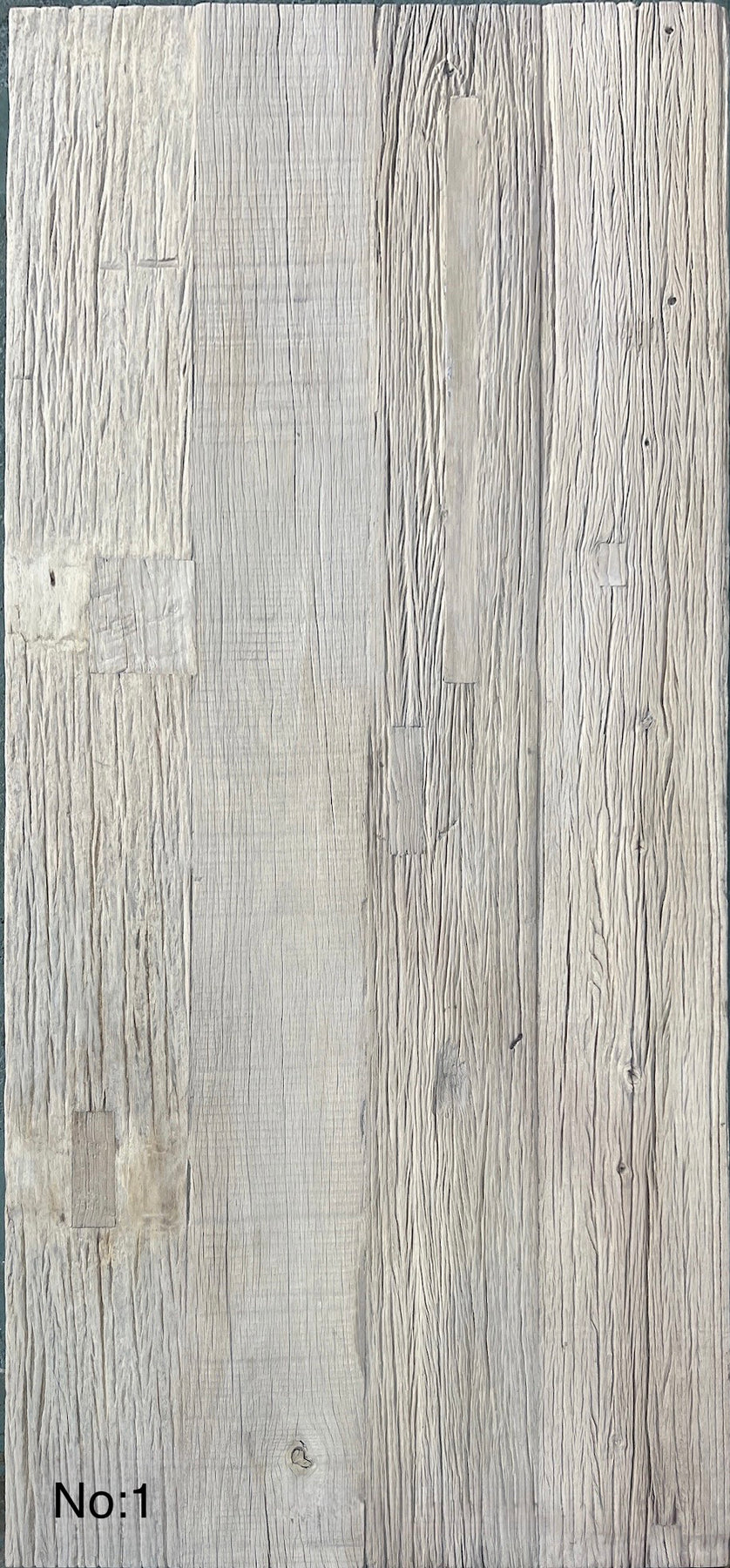 The tactile surface with planks of different widths (please do not expect a perfectly flat top). Wooden plugs and patches fill larger surface holes, often randomly placed.